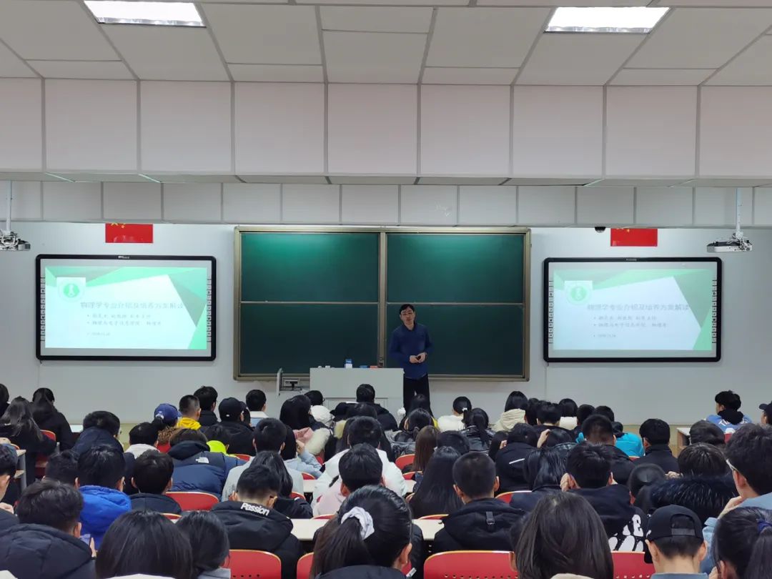 介绍中,朝克夫副教授为同学们从毕业要求与课程体系的设置、专业特色等众多方面介绍了物理学专业。朝克夫老师指出:物理学专业有较强的社会适应性,物理学专业学生所特有的专业素养适合在多行业从事科技开发、生产和管理工作。老师的话无疑坚定了同学们的奋斗目标,梳理了接下来的努力方向。