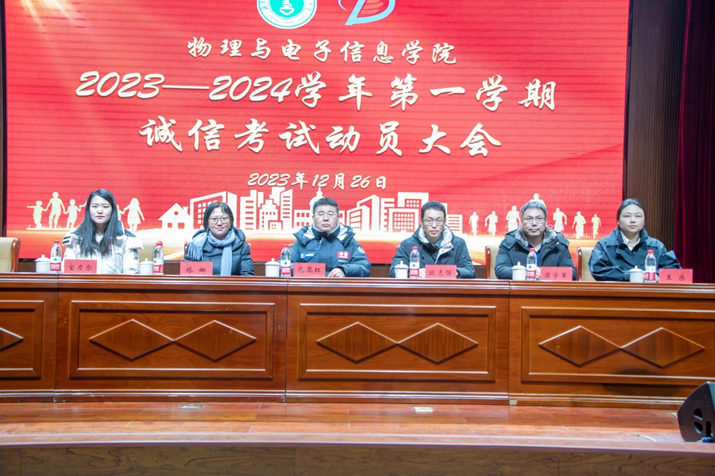 召开2023—2024学年第一学期诚信考试动员大会。学院副院长包黎红,党委副书记、副院长欧志强,物理系主任朝克夫,电子系主任梁学军,材料系副系主任塔娜,学就办副主任王乐,团总支副书记宝力尔,2023级班主任代表,辅导员出席会议,2023级本、硕学生400余人参加会议,会议由学院党委副书记、副院长欧志强主持。