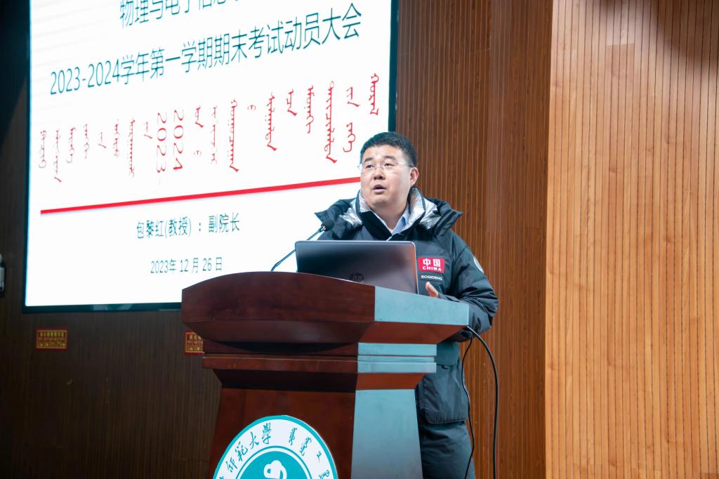 副院长包黎红教授作动员讲话暨专题讲座。包黎红老师对高等教育的改变,大学学习的注意事项,期末考试的注意事项,内蒙古师范大学考试管理规定等内容做了详细讲解。