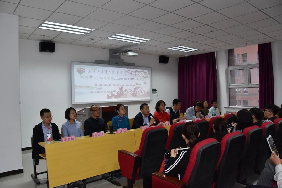 在理工楼A303室举行了2019级新生家长见面会。学院党总支书记刘美玲、副院长曹永军、副书记兼副院长张伟、副院长那日苏,辅导员王乐、宝力尔、 宋鑫伟,2019级班主任张院生(19汉1)、李喜彬(19汉2)、乌仁图雅(19蒙1)、保安(19蒙2)、包秀荣(19工1)、张林睿(19工2)、塔娜(19材料)与部分2019级新生家长80余人参加了见面会。见面会由学院党总支副书记兼副院长张伟主持。
