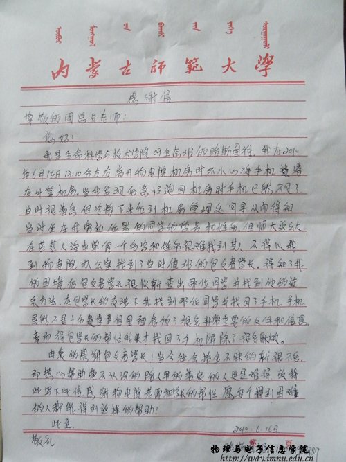 6月15日下午,球吧网 06预科班学生包文君同学在学院机房捡到一手机,及时找到失主并将手机归还给生科院学生。该生这种拾金不昧的精神值得我们学习,学院决定给予包文君同学全院通报表扬。