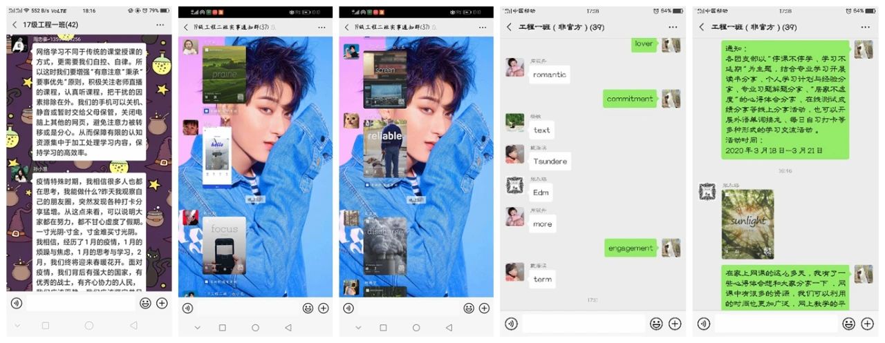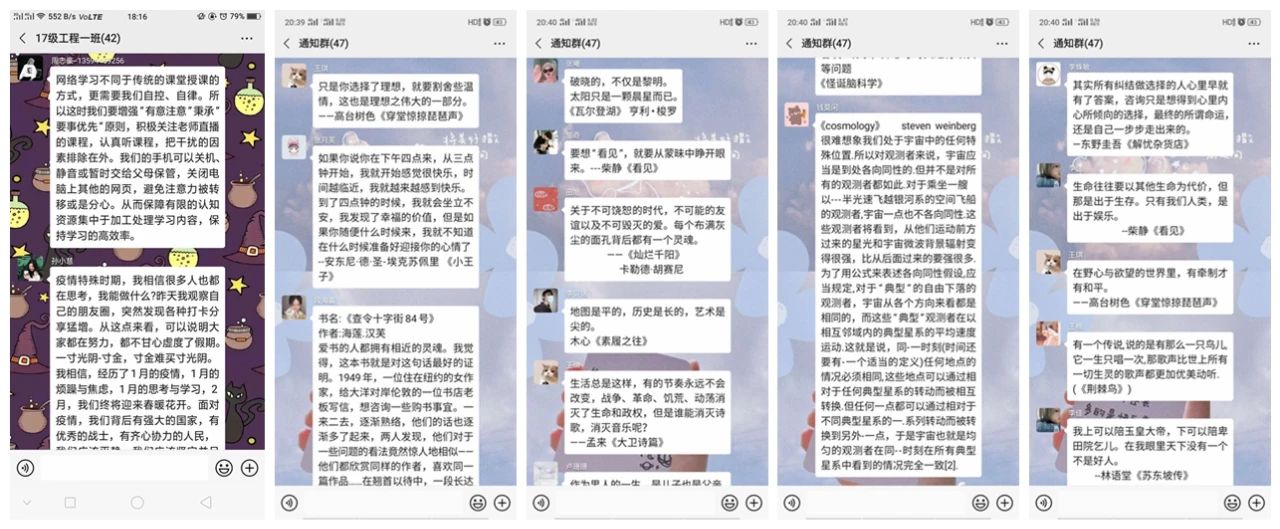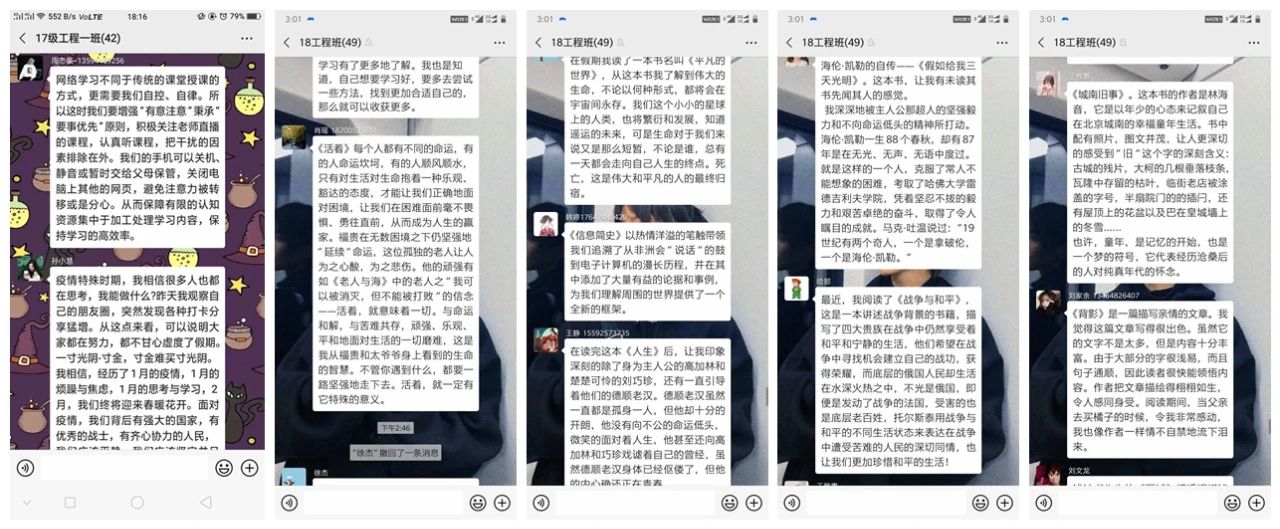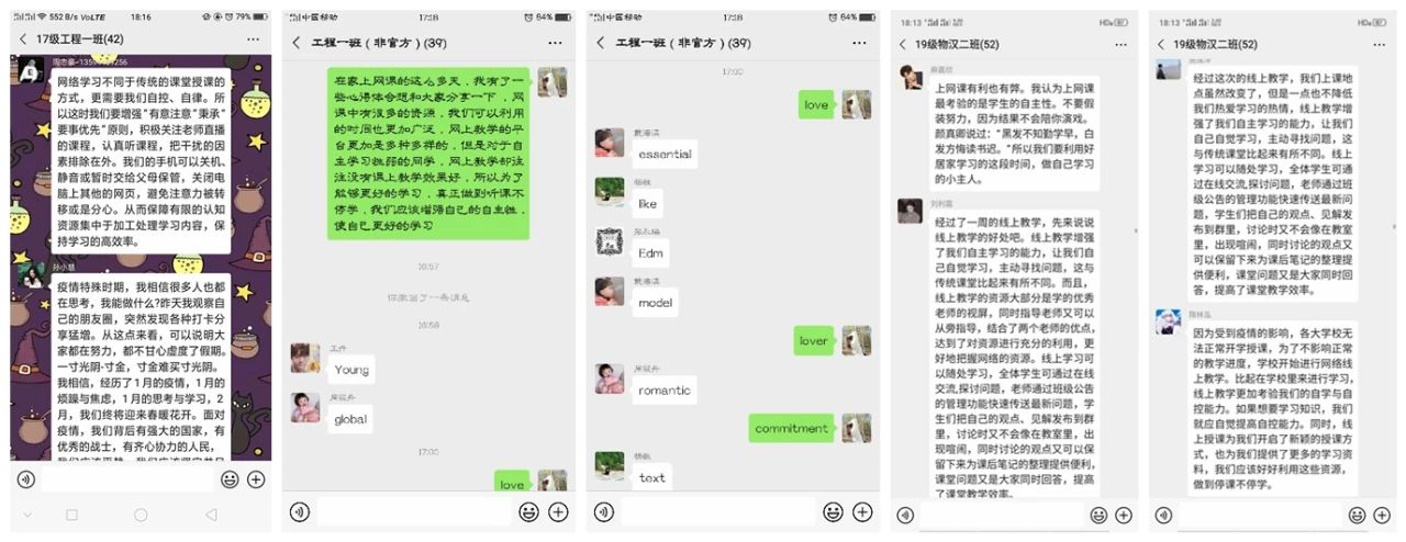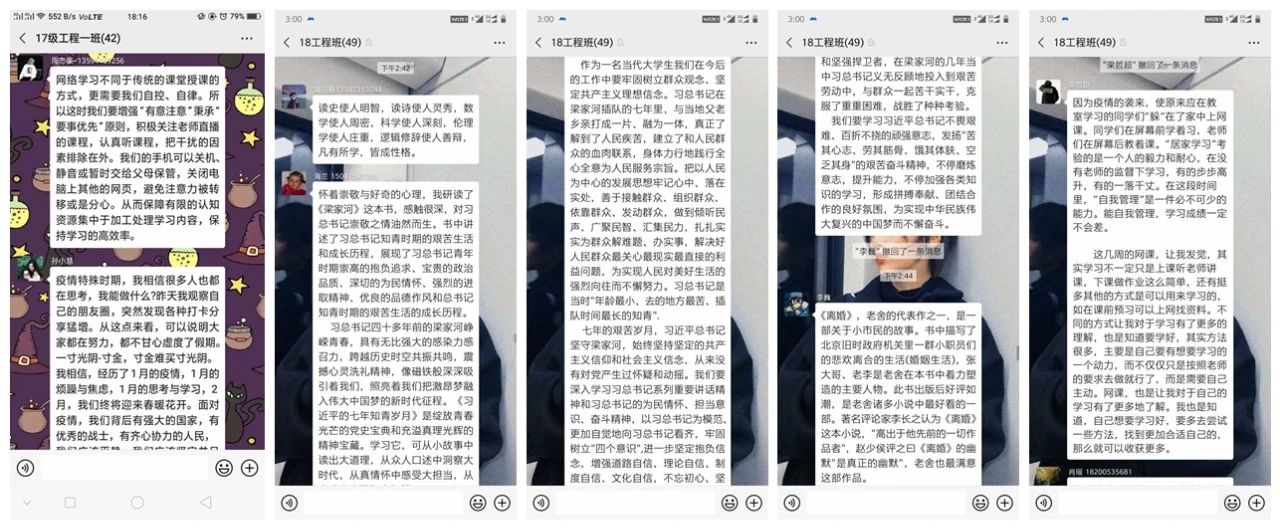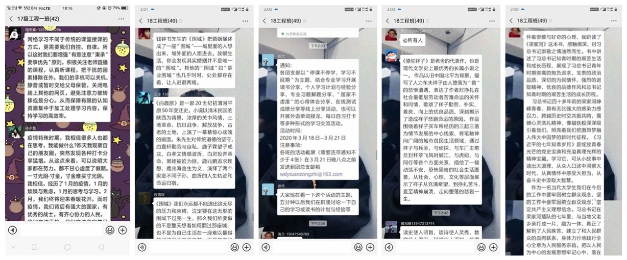 活动期间,同学们结合专业学习开展读书分享、个人学习计划与经验分享、专业习题解题分享、“居家不虚度”的心得体会分享、在线测试成绩分享等线上分享活动,与同学们交流假期内的经历计划,也有部分团支部开展外语单词接龙、每日自习打卡等多种形式的学习交流活动,积极督促同学们自主学习,自查自纠,营造良好的专业学习氛围。