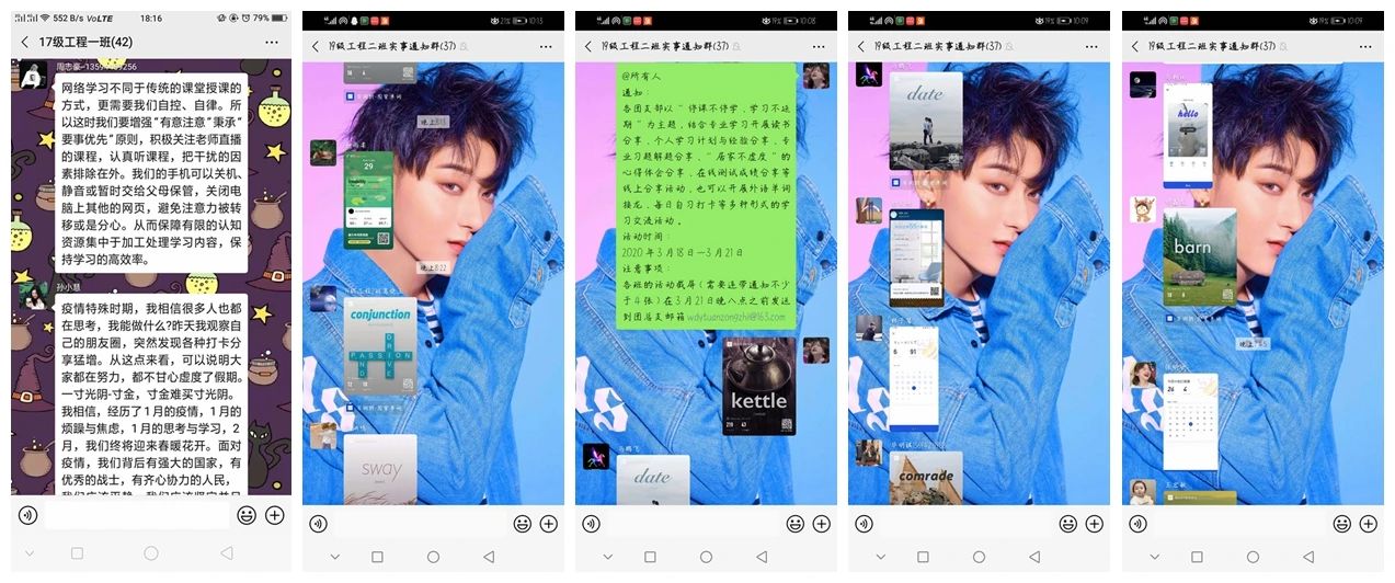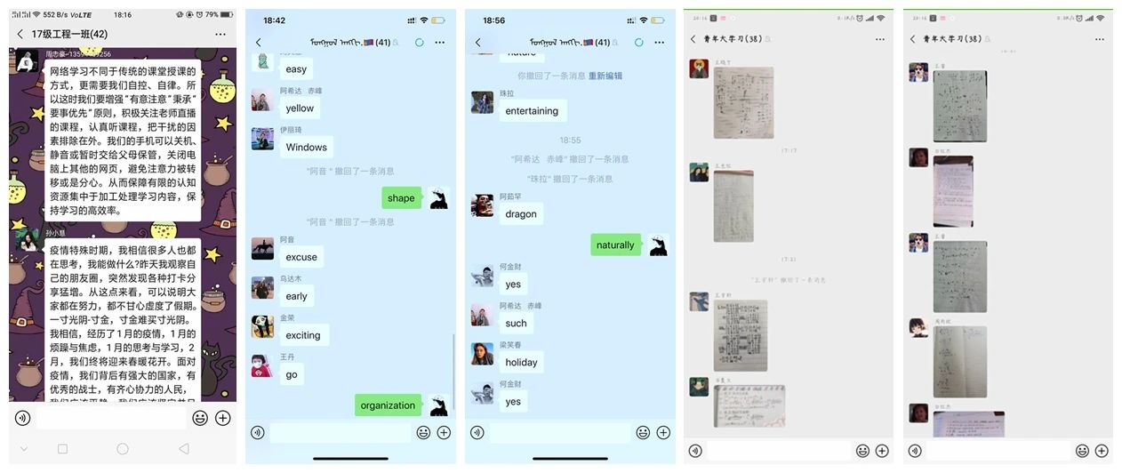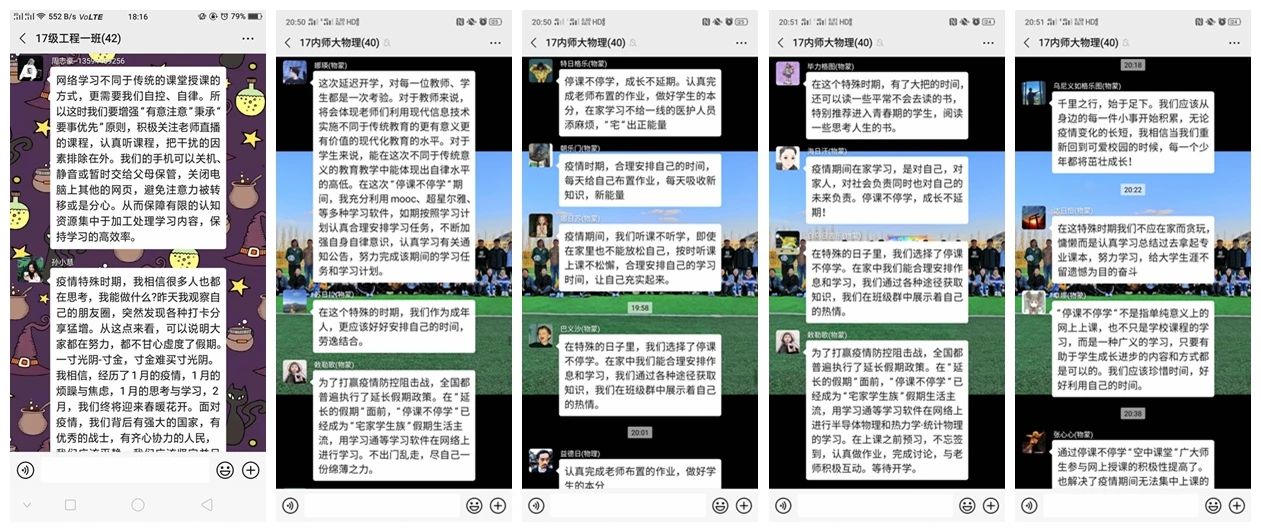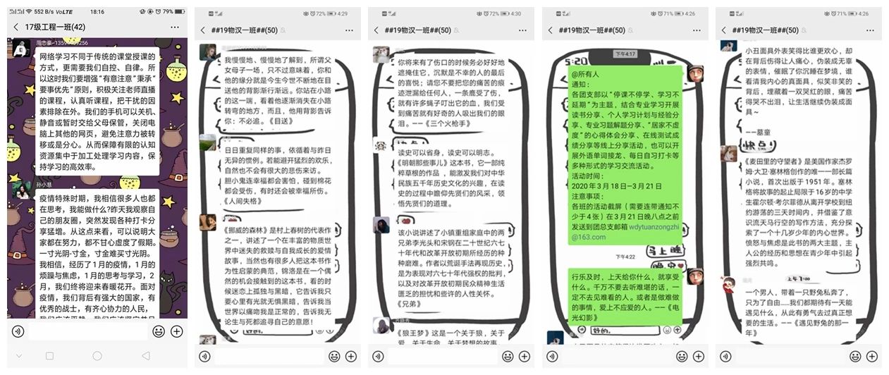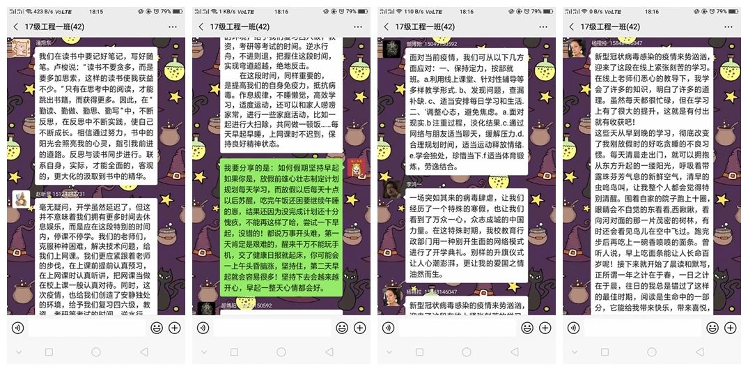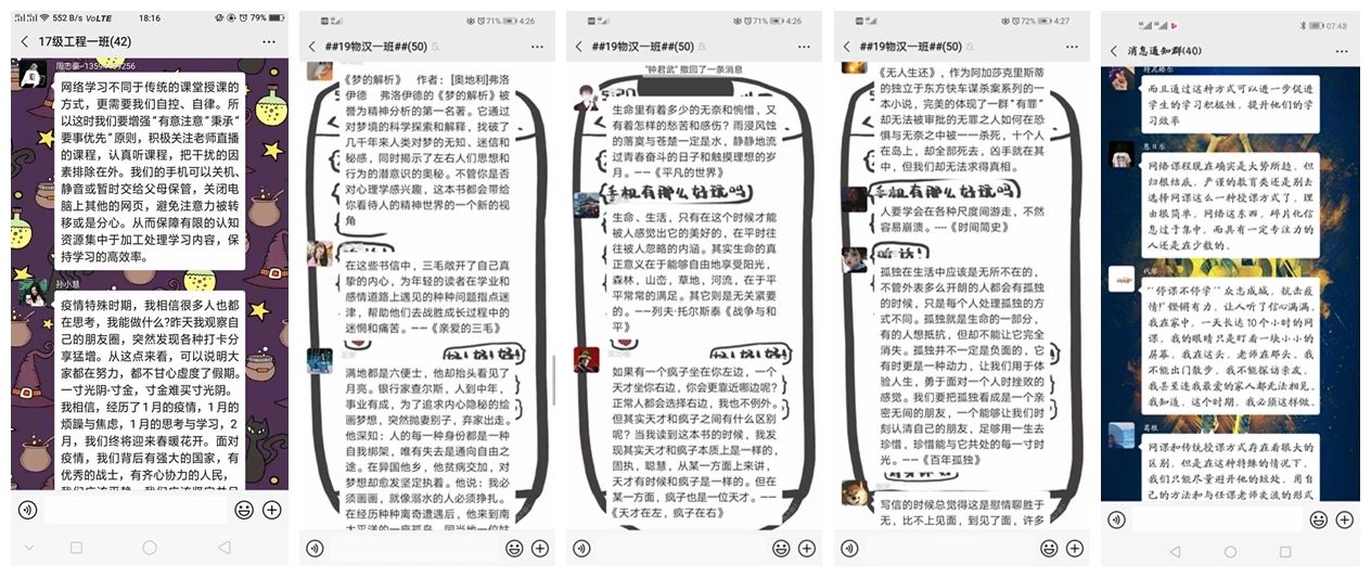 活动期间,同学们结合专业学习开展读书分享、个人学习计划与经验分享、专业习题解题分享、“居家不虚度”的心得体会分享、在线测试成绩分享等线上分享活动,与同学们交流假期内的经历计划,也有部分团支部开展外语单词接龙、每日自习打卡等多种形式的学习交流活动,积极督促同学们自主学习,自查自纠,营造良好的专业学习氛围。