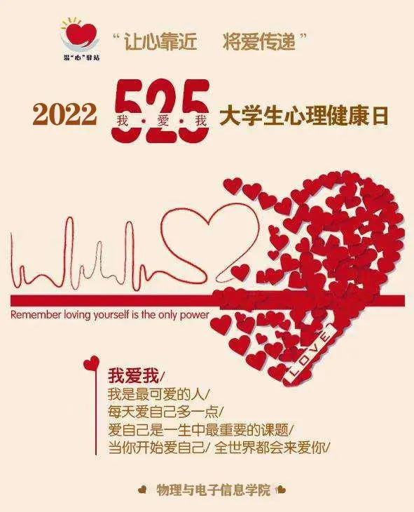 5月25日是全国大学生心理健康日,“5·25”的谐音即为“我爱我”,提醒大学生“珍惜生命,关爱自己”。核心内容是:关爱自我,了解自我,接纳自己,关注自己的心理健康和心灵成长,提高自身心理素质,进而爱别人,爱社会。