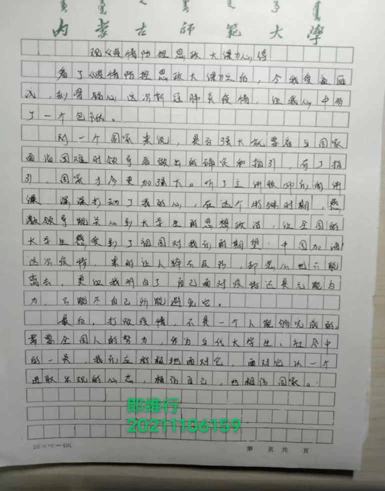 广大团员青年在校园疫情防控的关键时刻,增强战胜疫情的信心和决心,用实际行动展现新时代团员青年的责任与担当。我们普通人虽不能亲临主战场,但我们能坚持在大战中坚定信心、明确理想。