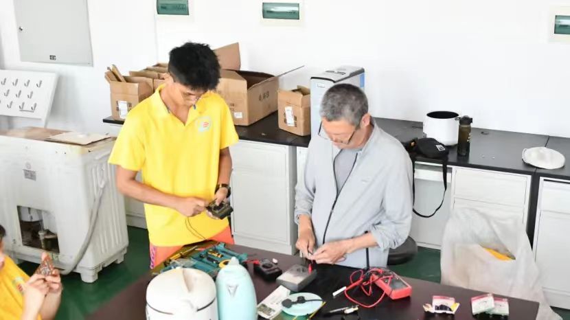 克伦老师结合专业,从理论知识普及和实操技能培训双管齐下,为志愿者们培训安全用电,家电测评,家电维修、工具安全使用和机械检修技能。