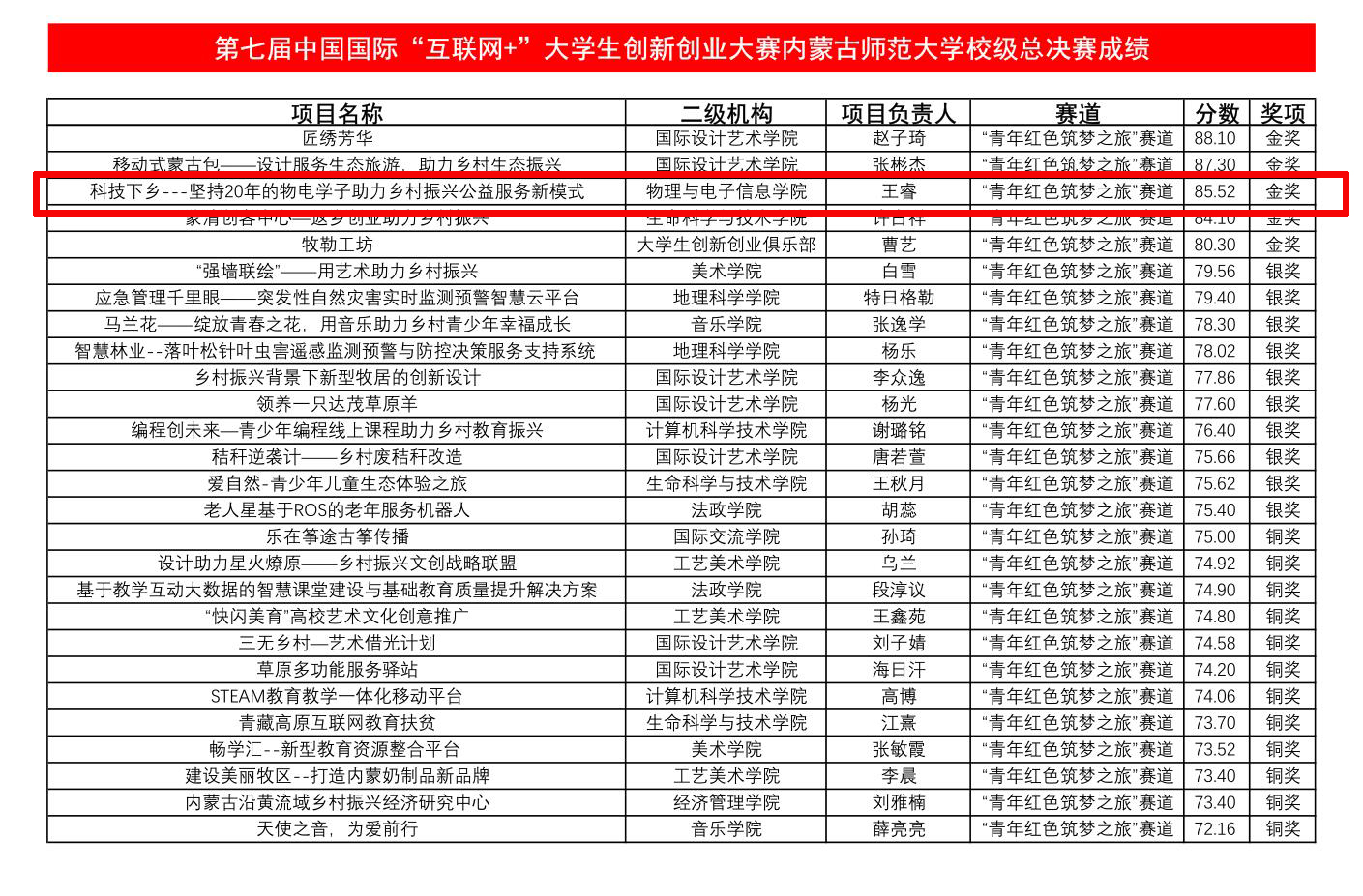7月12日,由招生就业处主办、计算机科学技术学院承办的第七届中国国际“互联网+”大学生创新创业大赛内蒙古师范大学校级总决赛在赛罕校区信息楼开赛。由球吧网 党委副书记兼副院长张伟、辅导员宝力尔、宋鑫伟指导的《科技下乡一坚持20年的物电学子助力乡村振兴》项目荣获“青年红色筑梦之旅”赛道金奖,项目负责人为2019级材料物理班王睿。