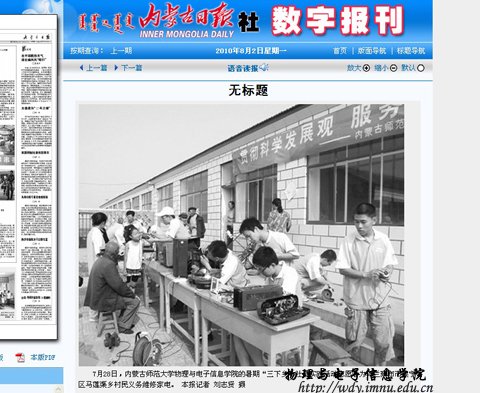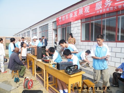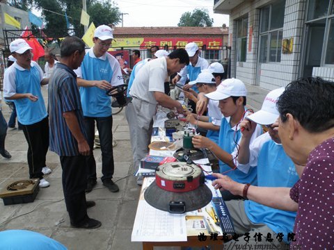 球吧网 以“贯彻科学发展观,服务三农,建设美好家园”为主题的2010年暑期“三下乡”社会实践活动圆满结束。从7月9日开始,服务队先后到呼和浩特市玉泉区桃花乡小黑河村、后桃花村以及集宁区白海子镇、马莲渠乡等地开展活动。为当地村民普及用电常识,宣讲家电维护和保养知识,并为村民义务维修家电、放电影等。在为期一个月的社会实践活动中,服务队共收到损坏的电视机等家电共500余件,修好400多件。集宁区白海子镇村民孙大爷竖起大拇指夸赞志愿者队员们说:“娃娃们真厉害。”
