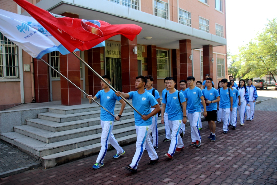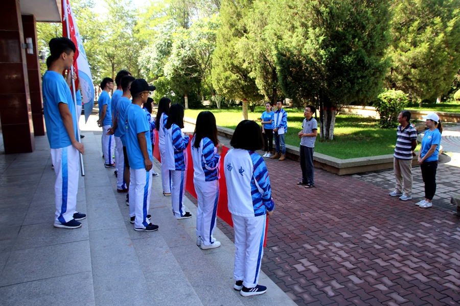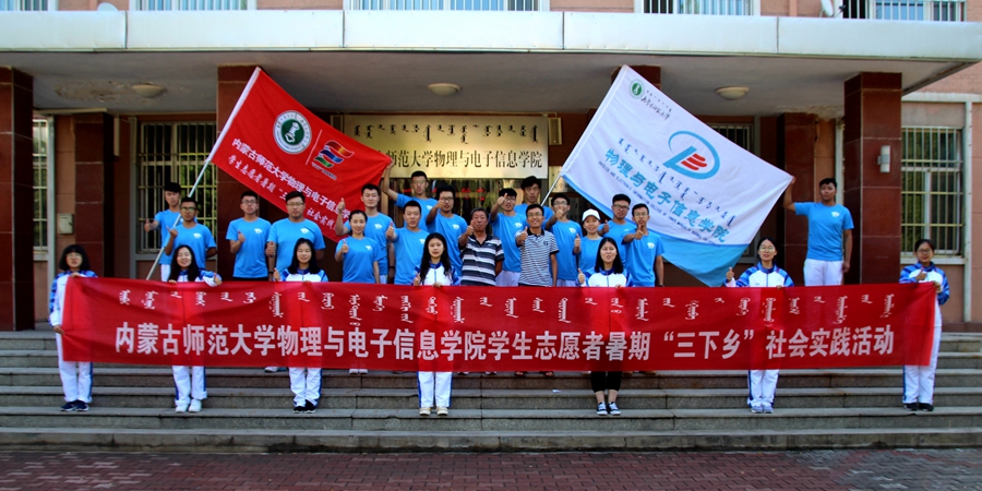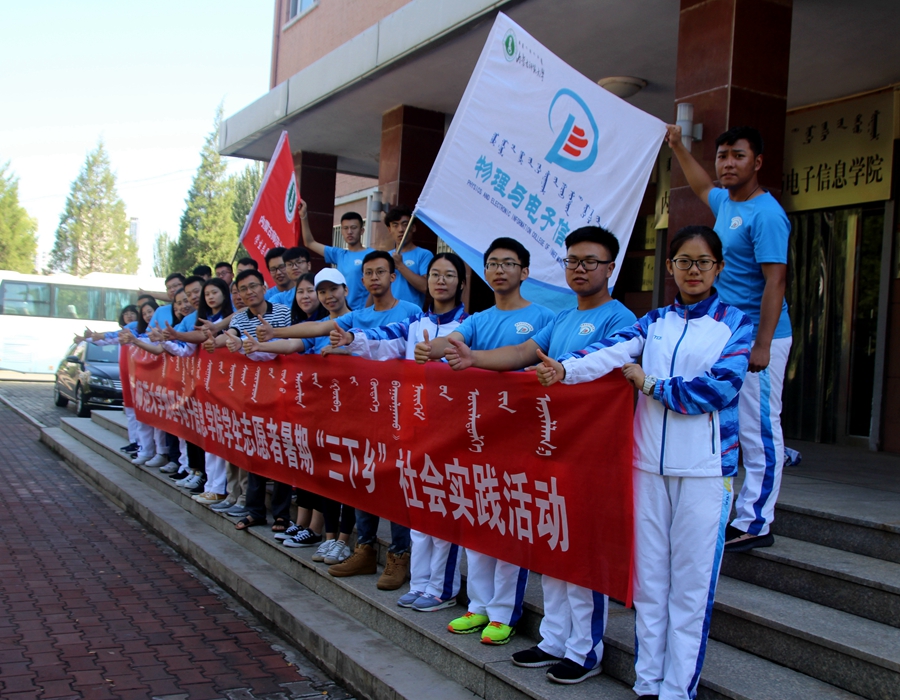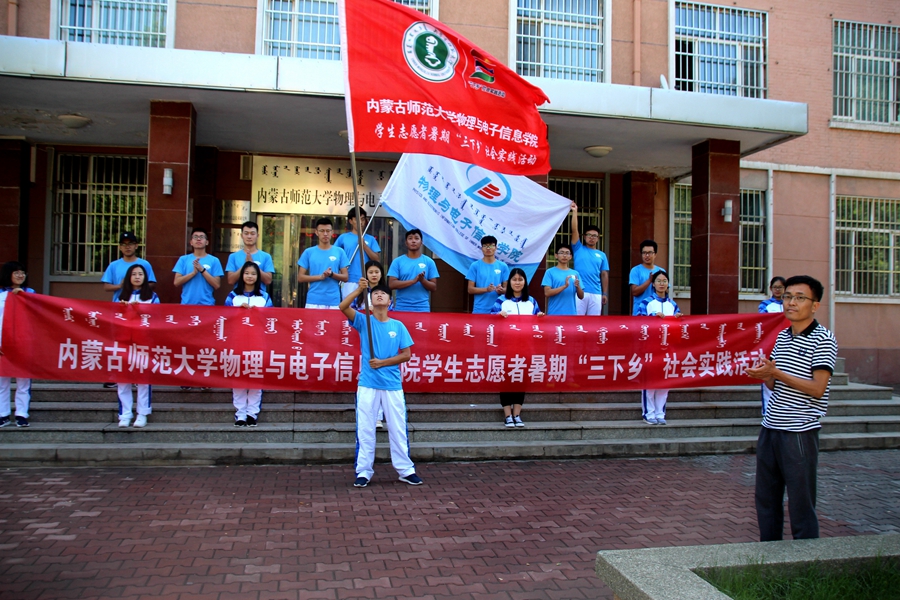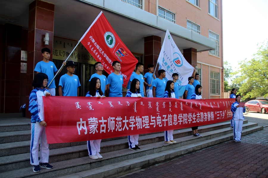 于物理楼前举行暑期“三下乡”社会实践活动出征仪式。学院党总支副书记何小龙老师、团总支书记萨其尔老师、志愿服务队指导教师克伦老师、学工办木其尔、芦嘉琛、苏日、宋鑫伟老师及志愿服务队成员参加仪式,由萨老师主持仪式。