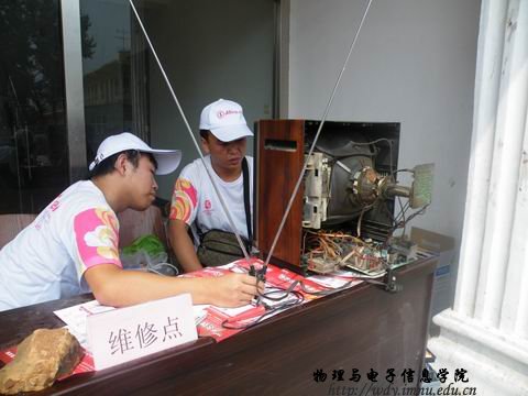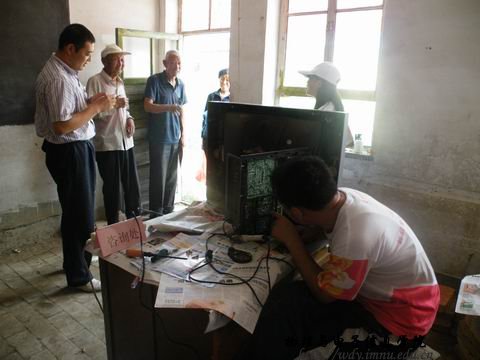 匆忙的吃过午饭后,我们直接动身来到了呼市周边第二站——田家营。我们已经不是第一次来到这里了,我们仍然将维修地点设在田家营小学院内,在这里看到了很多熟悉的面孔,看着村民们都期待着我们的到来,那种感觉特别亲切。赵金锁大爷竖起大拇指激动的对我们说:“感谢娃娃们照顾人民,为人民服务,电视早就不能看了,你们一来就(修)好了。希望你们以后能常来!”