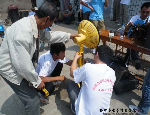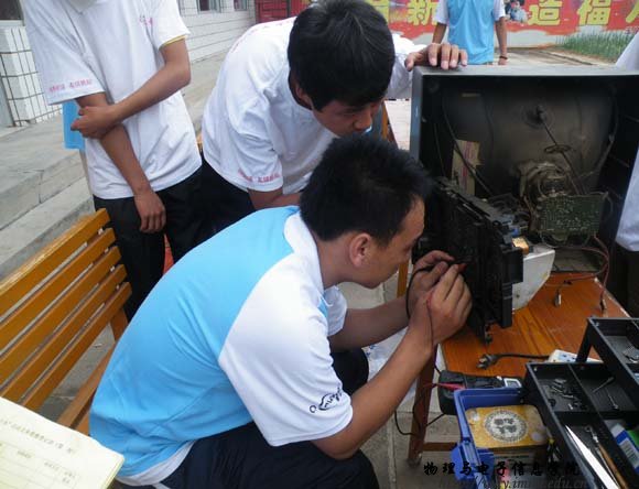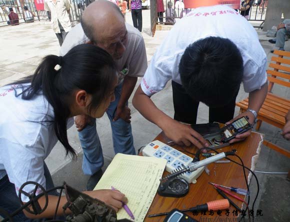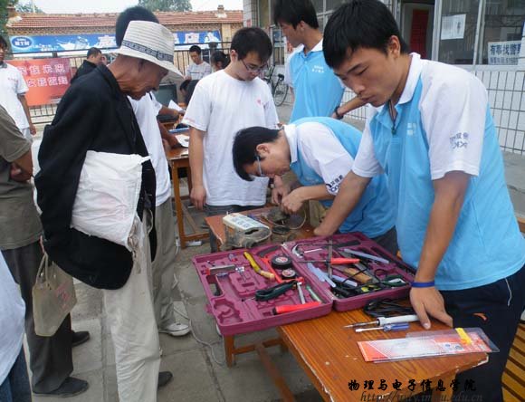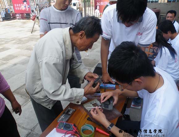 7月18日,志愿者服务队由院学工办张伟老师带队,共18名学生来到呼和浩特市玉泉区桃花乡后桃花村进行送科技下乡活动。上午9时,志愿者们在村委会院内设立了家电义务维修点。听说这一消息后,来维修家电的农民群众络绎不绝,活动一直延续到下午,送到维修点的电器有电风扇、电饭锅、电视机、DCD、录音机、热水壶、收音机、遥控器等50多件,修好30余件;部分志愿者还主动上门为村民调试卫星电视接收器等。本次活动受到了当地乡政府、农民群众的热烈欢迎。
