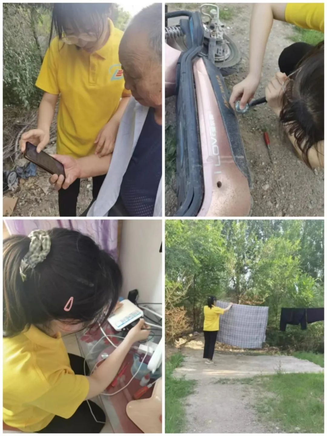 2021级物理学汉二班的黄珊珊“本着”走出校园,面向社会、深入农村、锻炼自我”的宗旨,在宝石镇宝林村进行了社会实践活动。她运用自己在学校学习的理论知识帮助村民修理电动车,机顶盒等坏掉的家用电器。在实践过程中,她还帮助不熟悉智能手机的老年人设置手机,帮助村民拔草、晾衣服等等。村民和村领导说她帮助农民解决了很多问题。她说:“能够运用自己在学校学到知识帮助到他人是一件很令人开心的事,一方面锻炼了自己的实践能力,另一方面帮助他人解决了问题,能够为他人做出一份贡献另我特别高兴,希望以后还能参加这样的活动。”
