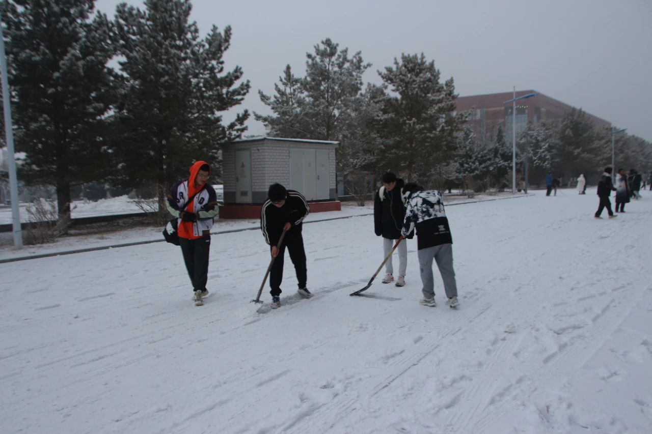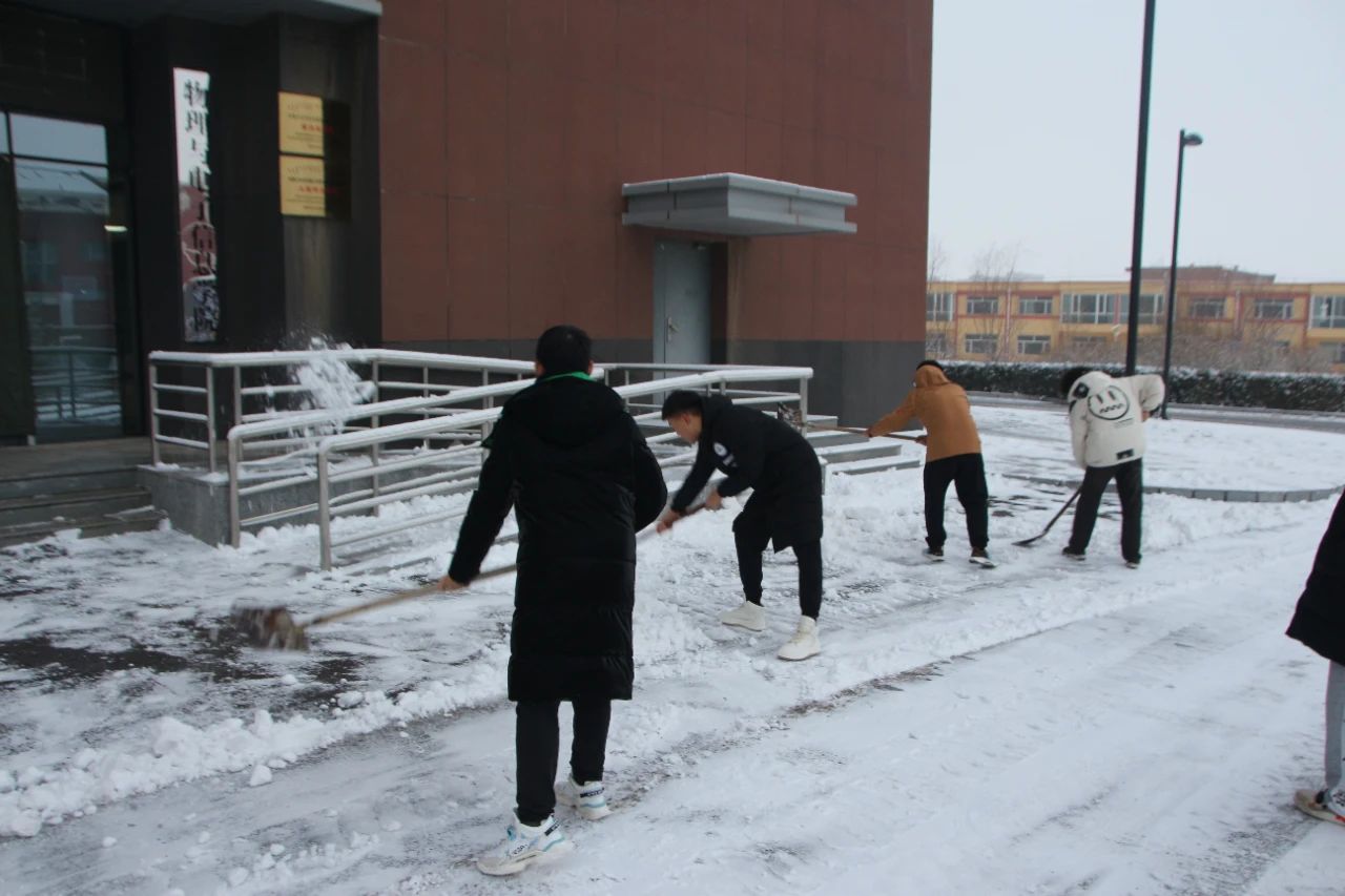 同学们对理工楼周边的积雪进行清扫,球吧网