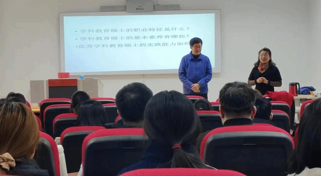 李群老师围绕“学科教育硕士的职业特征是什么、学科教育硕士的基本素养有哪些、优秀学科教育硕士的实践能力如何”三方面展详细阐释了作为一名现代教育硕士需要发展的标准和方向。
