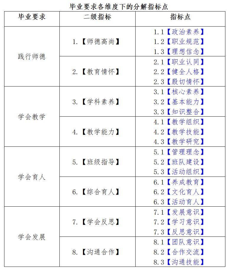 答:根据师范专业认证标准“一践行、三学会”要求,物理学专业毕业要求分为8个二级指标,每个二级指标分别从知识、能力和素质三个层面细分为3个指标点。物理学专业毕业要求共有24个指标点。