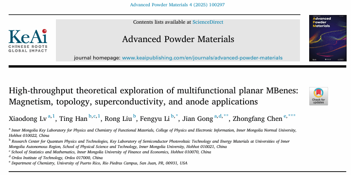 吕晓东副研究员、宫箭教授 (内蒙古师范大学兼职教授,博士生导师) 与内蒙古大学李锋钰教授、美国波多黎各大学陈中方教授合作在理论设计新型功能二维材料领域取得新进展,相关成果以“High-throughput theoretical exploration of multifunctional planar MBenes: Magnetism, topology, superconductivity, and anode applications”为标题发表在国际材料科学期刊《Advanced Power Materials》上(中科院1区top期刊,IF = 24.9)。吕晓东副研究员为第一作者,李锋钰教授、宫箭教授、陈中方教授为论文共同通讯作者,内蒙古师范大学为第一完成单位。(论文链接://www.sciencedirect.com/science/article/pii/S2772834X25000338)。