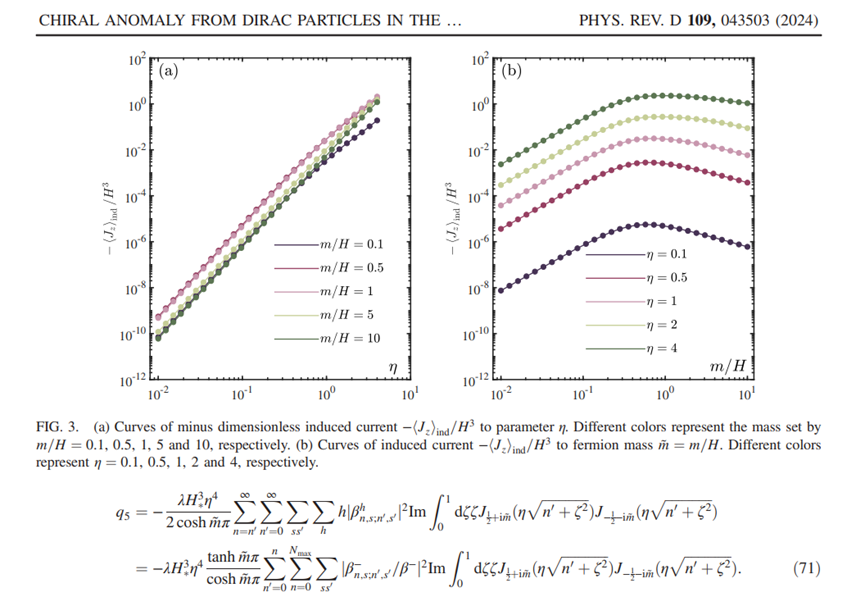 教师李喜彬担任通讯作者。作者通过理论计算得到了狄拉克粒子在de Sitter真空中的手性不对称率为tanh(πm/H),其中m为粒子质量,H为暴涨阶段的哈勃参量;狄拉克粒子的手性反常与朗道能级的简并性有着密切的联系;同时指出,狄拉克粒子的手性反常(重子数不对称)是粒子手性对称性破缺以及真空对称性破缺共同作用的结果。成果对研究宇宙学中的重子对称性破缺问题有着重要的理论价值。