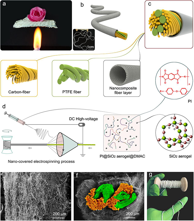 该工作设计制备了一种新颖的柔性、耐高温的全纱线摩擦纳米发电机(Y-TENG),用于收集电能和自驱动感知生物机械运动,其阻燃性和耐高温功能的展示如图1a所示。作者以多股碳纤维作为电极,聚四氟乙烯作为摩擦电功能材料,最外层为纳米复合层,该复合层是由二氧化硅气凝胶和聚酰亚胺组成,其结构和组成如图1b-c所示。作者采用简单的纳米包覆静电纺丝工艺,将复合层包裹在导电螺旋纤维束上,形成紧密包裹的核壳结构,制备了该气凝胶纳米包覆摩擦电纱线,制备工艺和化学组成如图1d所示。该纱线具有与普通纱线相同的柔软度,如图1g所示。同时,摩擦电纱线的核壳结构的微观结构如图1e -f所示,该核壳结构设计对各种机械触发源具有较高的灵敏度。最后,作者利用该纱线制作了一种平纹结构的Y-TENG,可同时承受拉伸、折叠、卷曲等各种复杂机械变形,用于收集生物机械能并转化为电能,可作为一种柔性的、可植入到衣物中的便携式分布式电源。研究显示,该Y-TENG器件能够实现转移电荷密度为30 nC cm-2,在外部负载电阻为180 MΩ时,峰值功率达到0.17 mW,机械触发的平均响应时间小于15 ms。