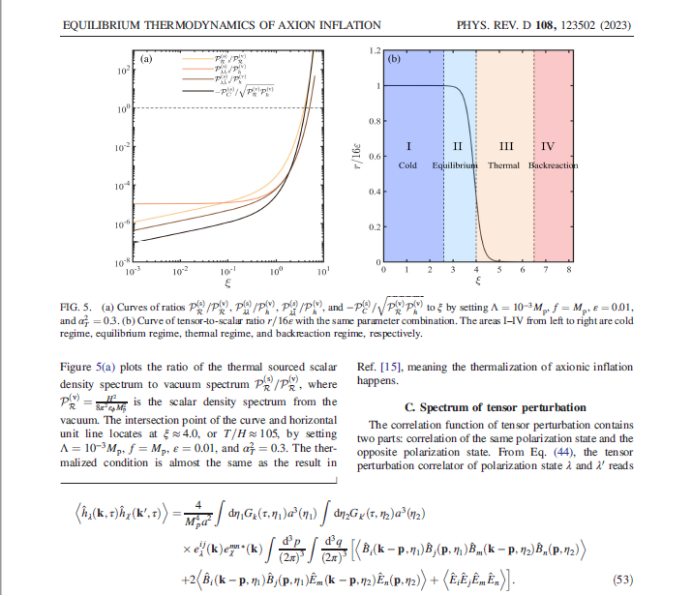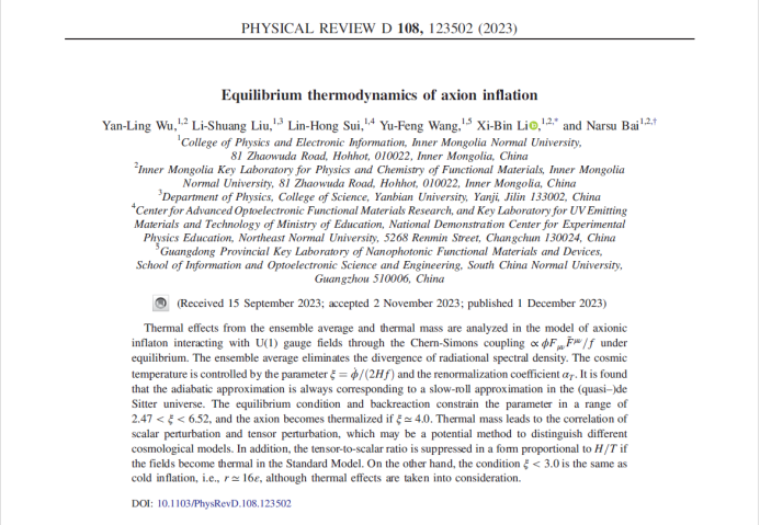 教师李喜彬、那日苏担任共同通讯作者。作者利用冷暴涨理论框架,系统研究了与U(1)规范场耦合的轴子暴涨模型,理论上论证了热力学绝热近似与几何动力学慢滚近似的等价性。同时利用格林函数理论计算了规范场作为热背景对标量扰动、张量扰动功率谱的影响,同时发现对于强耦合的情况,模型的张标比(tensor-to-scalar ratio)以H/T的形式压缩(H表示哈勃参量,T表示宇宙学温度),这与暖暴涨所得到的结论一致,从而论证了基于热力学基本理论研究早期宇宙热效应的合理性。