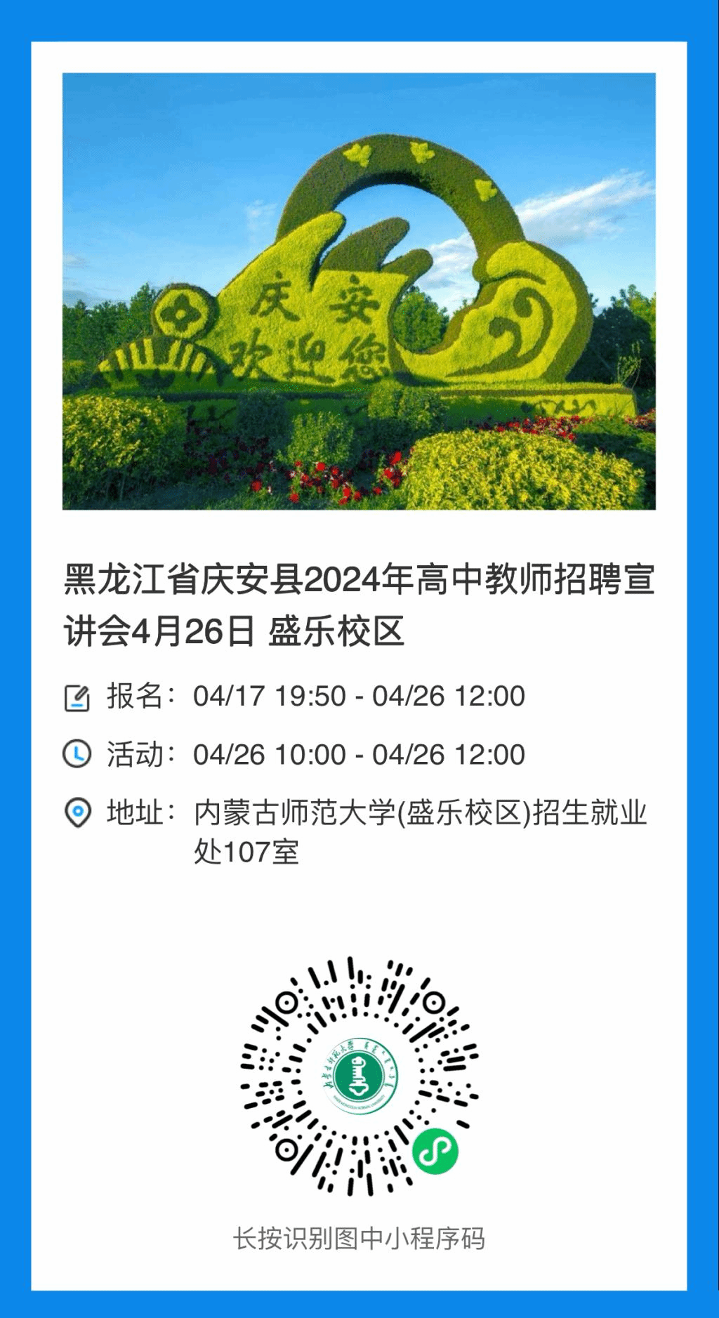 1、宣传动员。4月17日在哈尔滨师范大学、内蒙古师范大学高校网站发布公告,招聘有志愿扎根基层从事教育工作,热爱教育事业的有志青年来庆安工作。