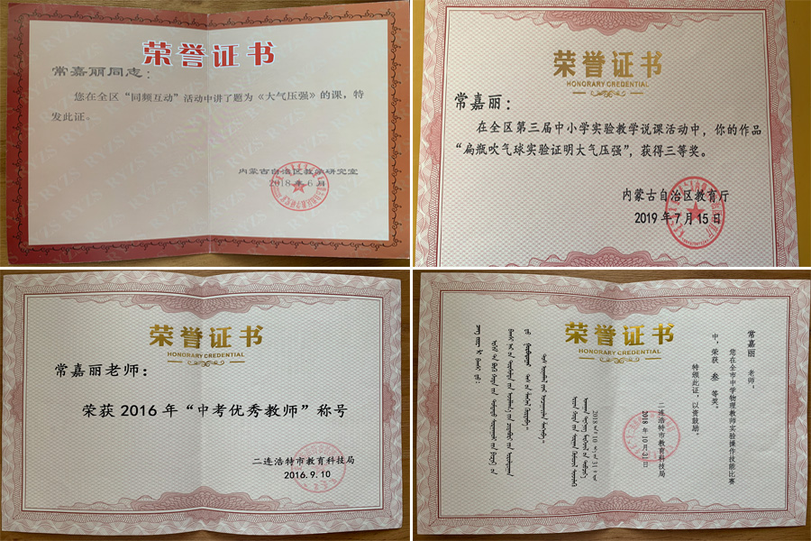 2014年至今,参加工作7年,她先后担任物理教师、班主任、初中部教务处主任、校课程研究中心副主任等职。在二连浩特市领导和第一中学校领导的培养下成长得很快,得到学生和家长的广泛认可。先后被二连浩特市委市政府评为“市级优秀教师”,被二连浩特市教科局评为“中考优秀教师”,获二连浩特市教学基本功大赛一等奖,在锡林郭勒盟初中课堂教学改革现场会承担物理学科观摩展示课……