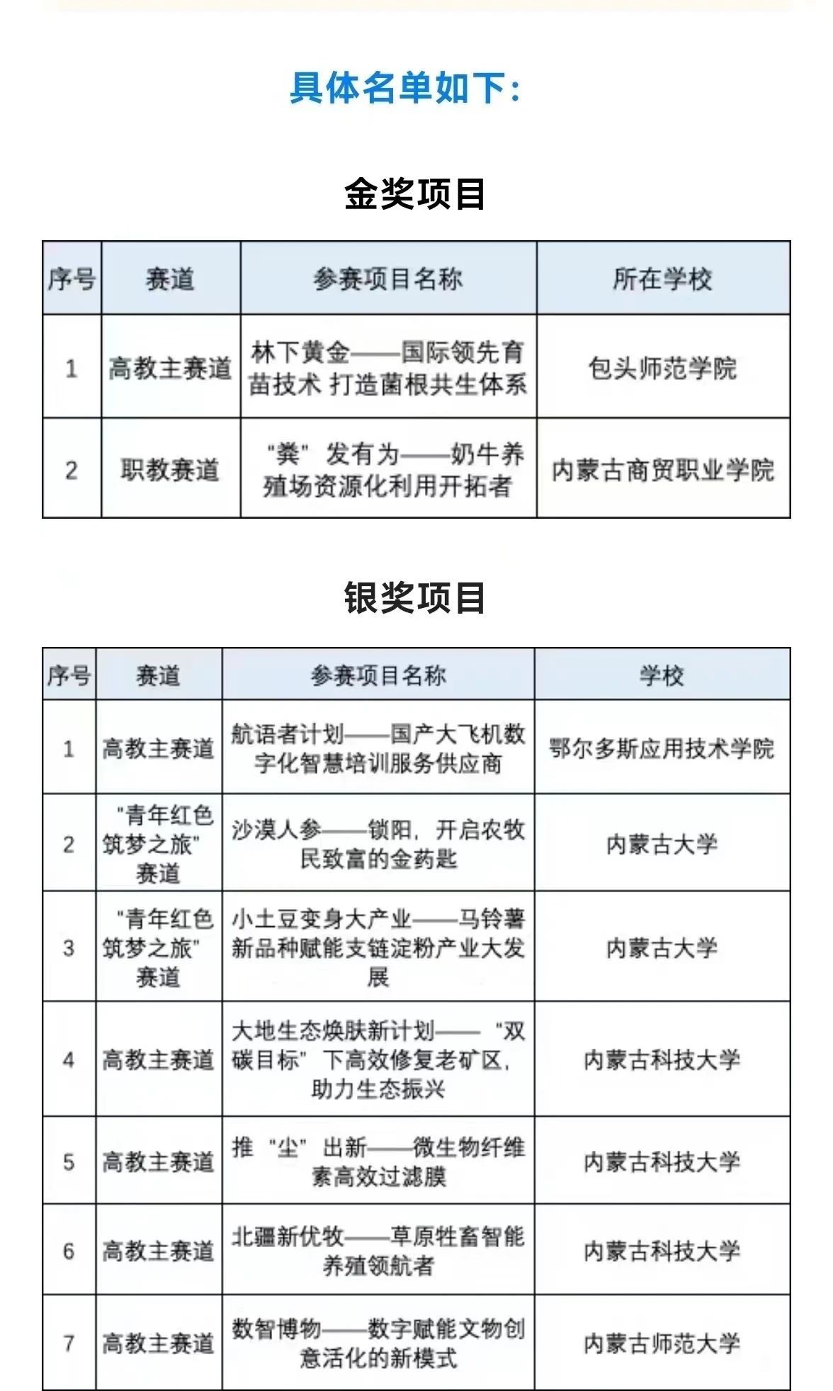 选送的“科技下乡——坚持20年的助力农业农村现代化公益服务”获得“青年红色筑梦之旅”赛道铜奖,该项目由张伟、宝力尔老师指导;“全光谱照明用荧光材料开发和应用技术”获得产业命题赛道铜奖,该项目由朝克夫、那日苏老师指导。两项目的获奖,实现了球吧网