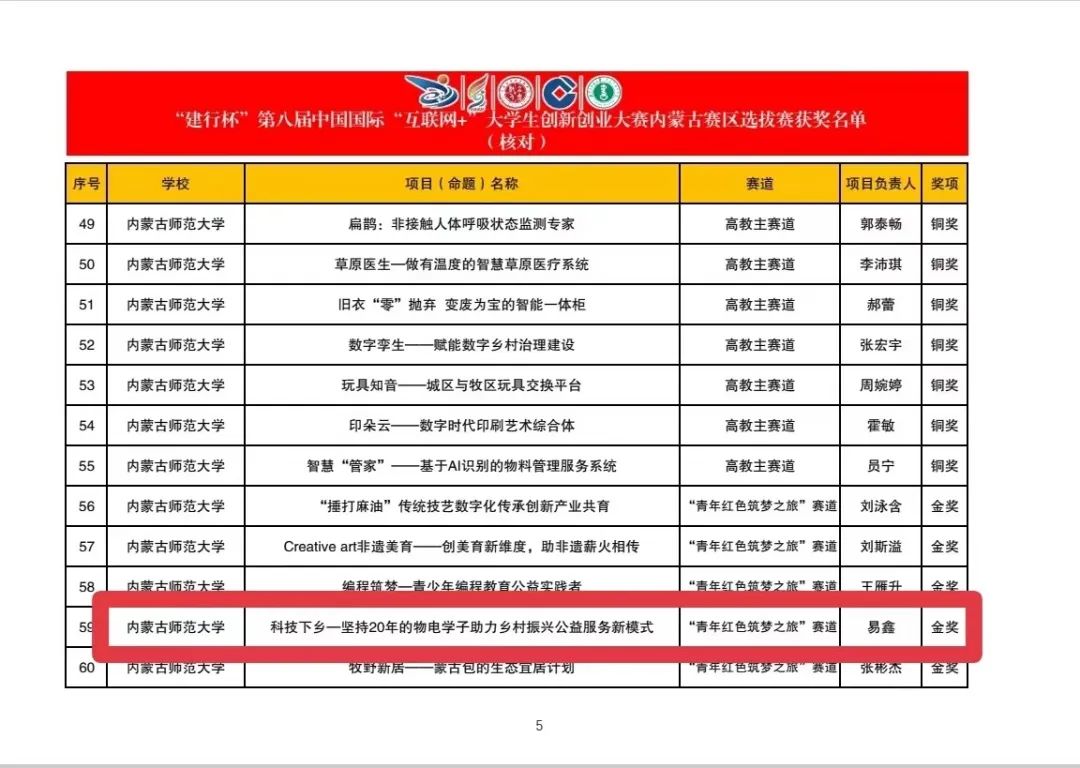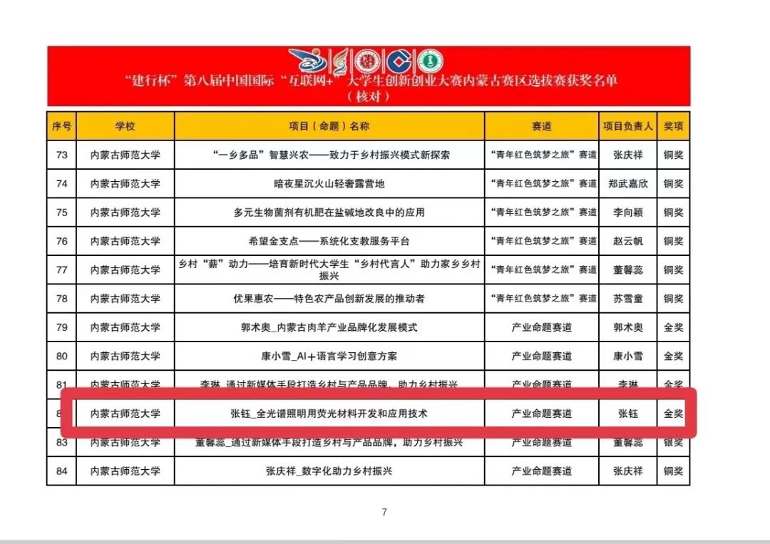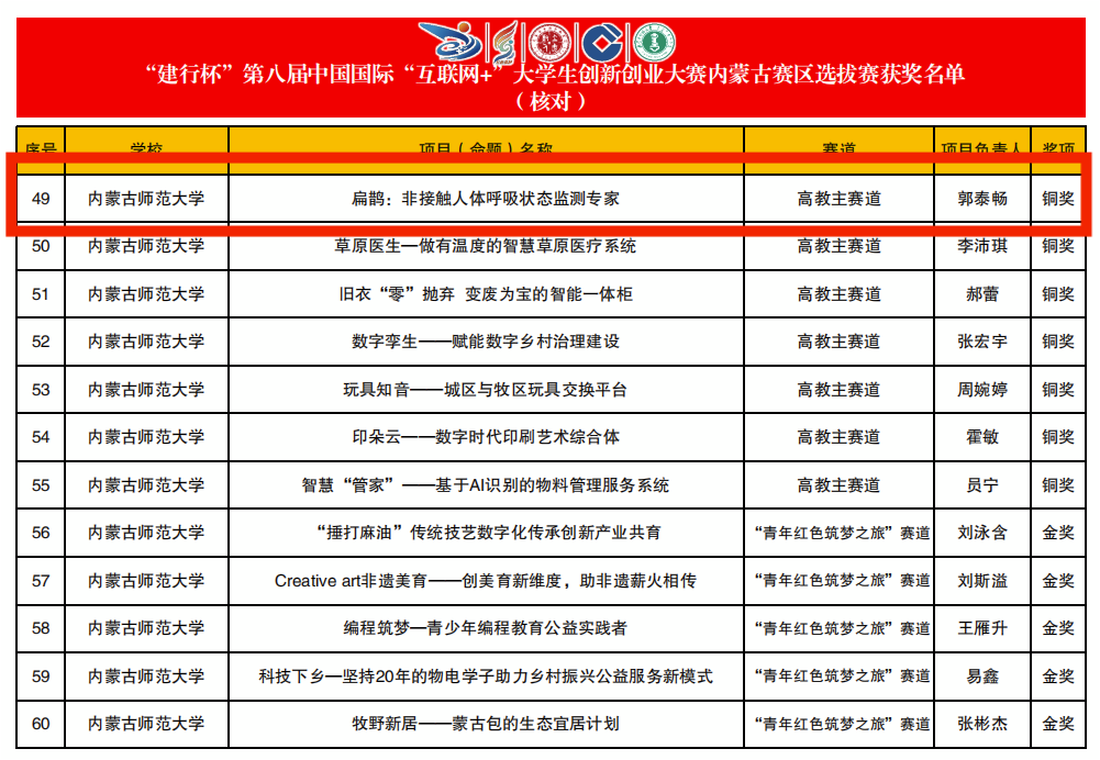 在8月11日刚刚落幕的第八届中国国际“互联网+”大学生创新创业大赛内蒙古赛区选拔赛中,球吧网 《草立方——牧草补光生长方案开创者》《科技下乡---坚持20年的物电学子助力乡村振兴公益服务新模式》《全光谱照明用荧光材料开发和应用技术》三个参赛项目分别斩获高教主赛道、“青年红色筑梦之旅”赛道、产业命题赛道金奖!《扁鹊:非接触人体呼吸检测专家》获得高教主赛道铜奖。其中《科技下乡---坚持20年的物电学子助力乡村振兴公益服务新模式》《全光谱照明用荧光材料开发和应用技术》两个项目获得参加国赛资格。这是球吧网 在“互联网+”赛事取得的又一历史性突破。